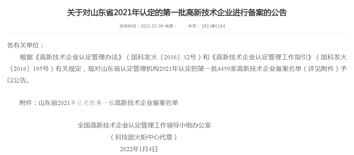 近日,山東省高企業(yè)認定管理工作網(wǎng)公布了《關(guān)于對山東省2021年認定的diyi批企業(yè)進(jìn)行備案公示的通知》,