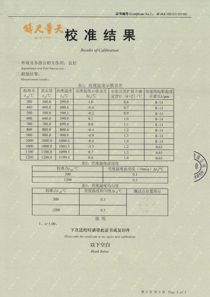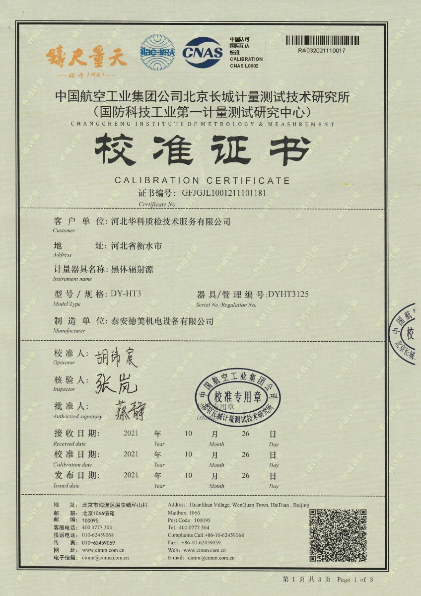 | 上一條:河北華科質(zhì)檢技術(shù)服務(wù)有限公司-黑體輻射源(DY-HT2) | 下一條:超低溫面源黑體爐(-40-80℃)校準證書(shū) |