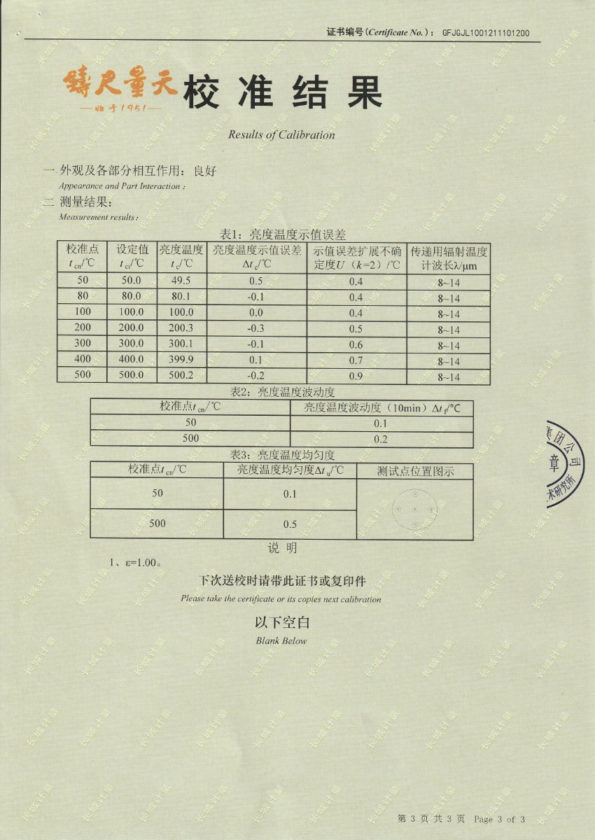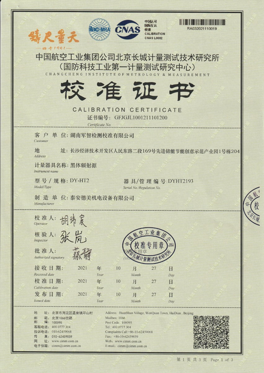 | 上一條:河北華科質(zhì)檢技術(shù)服務(wù)有限公司-黑體輻射源(DY-HT3) | 下一條:超低溫面源黑體爐(-40-80℃)校準證書(shū) |