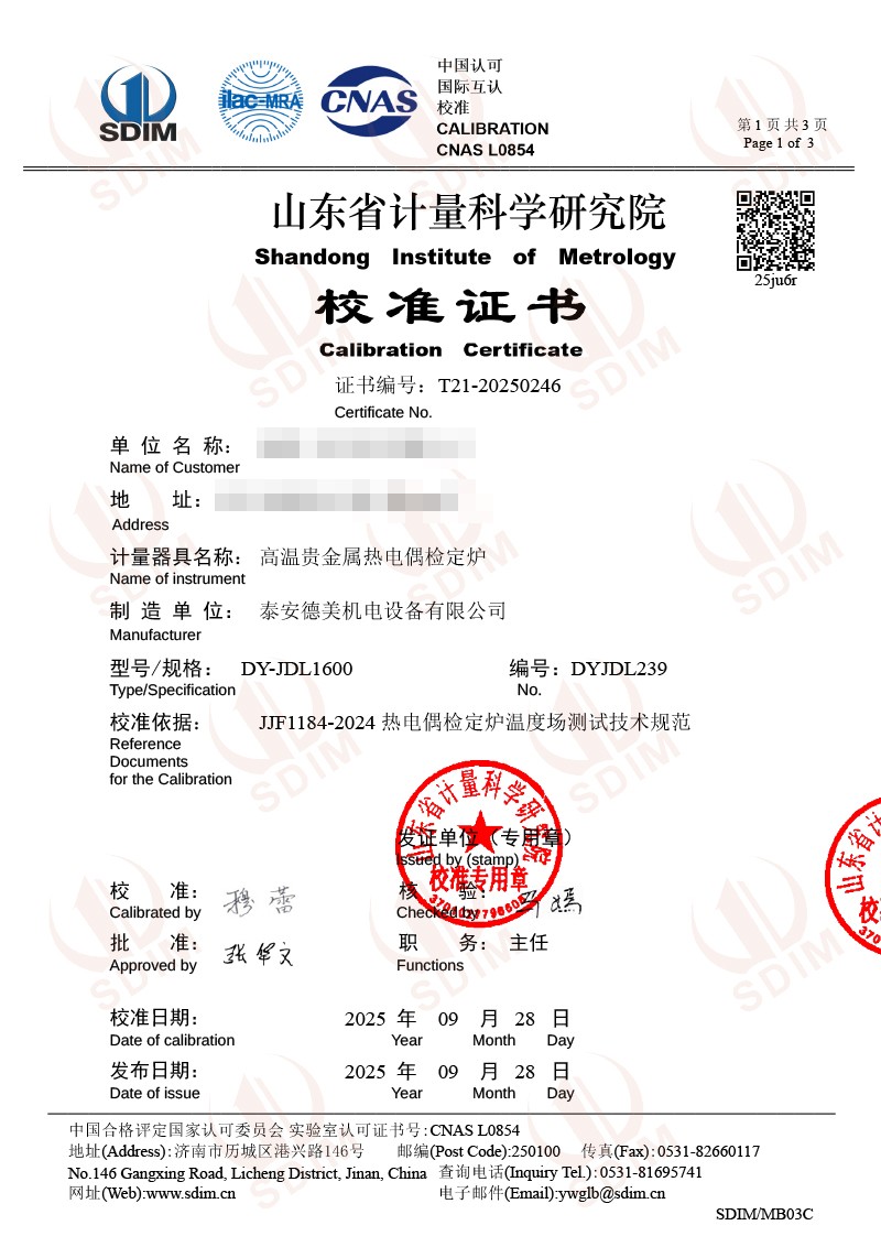 高溫貴金屬熱電偶檢定爐(800-1600℃)校準證書(shū) 2025-10-14 本文被閱讀 166 次