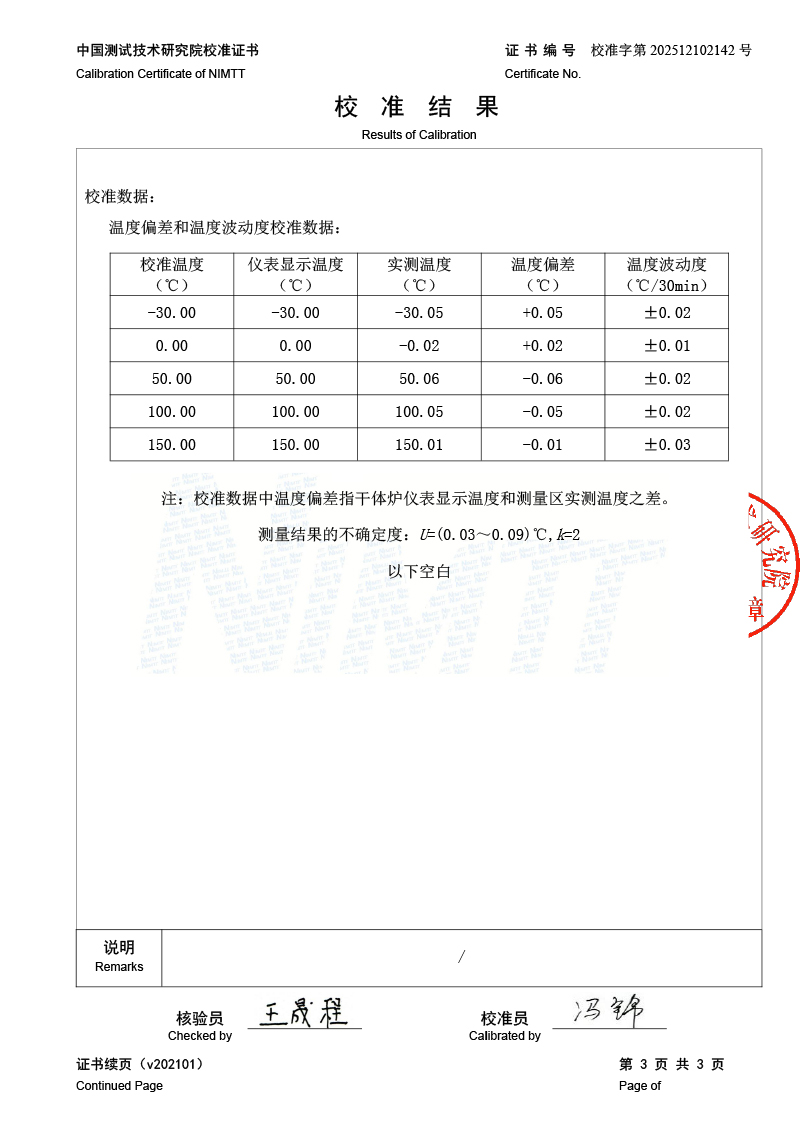 低溫干體爐校準證書(shū)